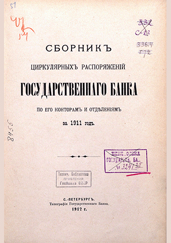 Сборник циркулярных распоряжений Государственного банка по его конторам и отделениям за 1911 год / Государственный банк. — Санкт-Петербург : Типография Государственного банка, 1912. — XII, 125, 94 с.. — . Напечатано по старой орфографии.