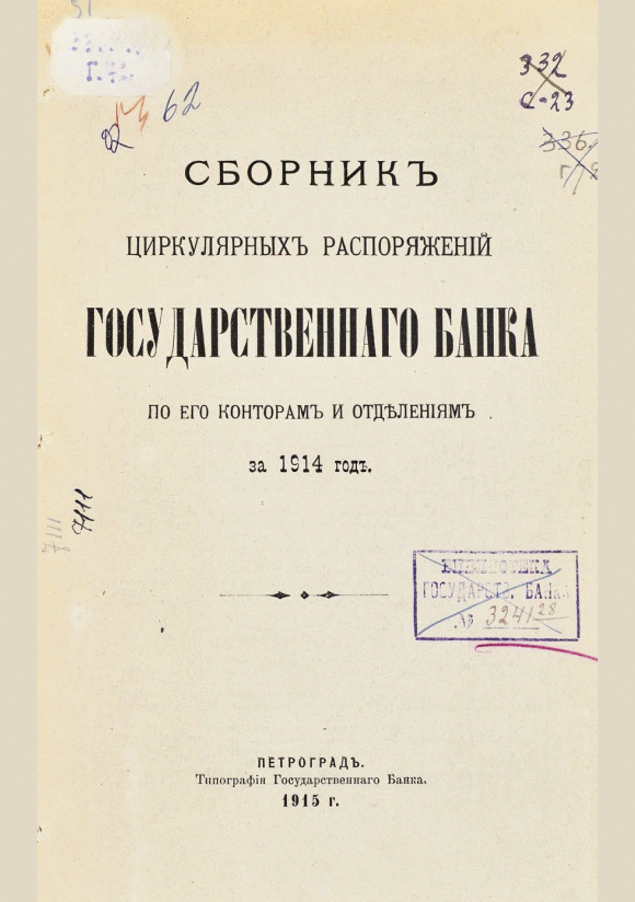 Сборник циркулярных распоряжений Государственного банка по его конторам и отделениям за 1914 г. / Государственный банк. — Петроград, 1915. — 312 с.. — . Напечатано по старой орфографии.