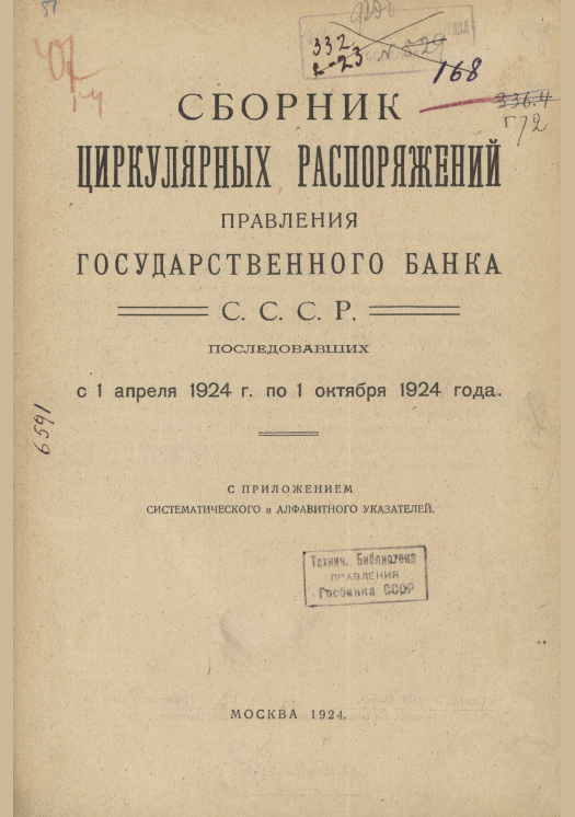 Сборник циркулярных распоряжений Правления Госбанка СССР, последовавших с 1 апреля 1924 года по 1 октября 1924 года / Государственный банк СССР. Правление. — Москва : Госиздат, 1924. — XLIII, 432 с.: табл.. — Сист. указ.: с. V-XXX. -Предм. указ.: с. XXXI-XLIII. — 3000.