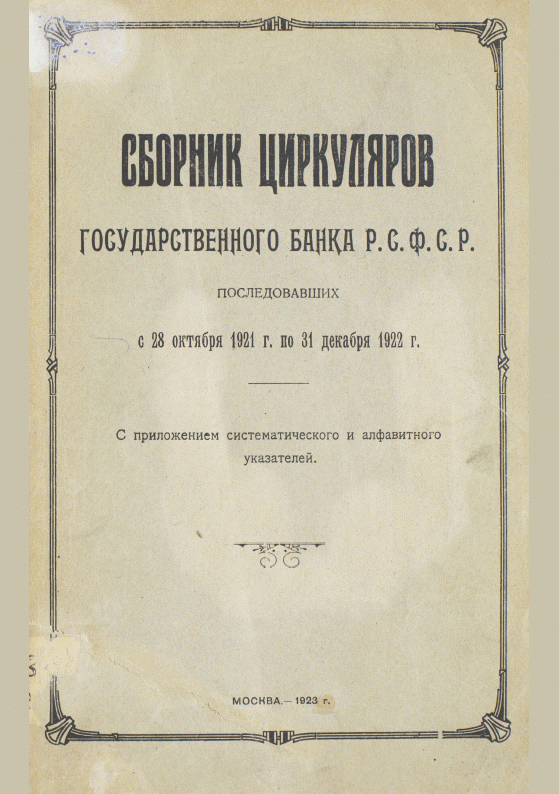 Сборник циркуляров Государственного банка РСФСР, последовавших с 28 октября 1921 г. по 31 декабря 1922 г. / Государственный банк РСФСР. — Москва : Военная Типография Штаба Р.К.К.А., 1923. — LII, [1], 234 с.: табл., обр.. — Сист. указ.: с. V-XXXVII. -Алф. указ.: с. XXXIX-XLIX. -Переч.: с. LI-LII. — 4000.