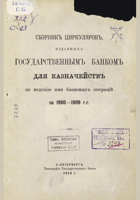 Сборник циркуляров, изданных Государственным банком для казначейств по ведению ими банковских операций за 1900-1909 гг. / Государственный банк. — Санкт-Петербург : Типография Государственного банка, 1910. — 271 с.. — . Напечатано по старой орфографии.