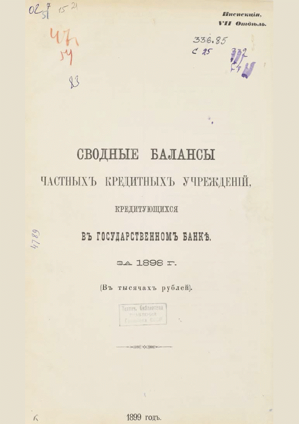 Сводные балансы частных кредитных учреждений, кредитующихся в Государственном Банке за 1898-1902 г.г. : (в тысячах рублей) / [Государственный банк], Инспекция, VII отдел. — Б.м., 1899-1903. — 365 с.