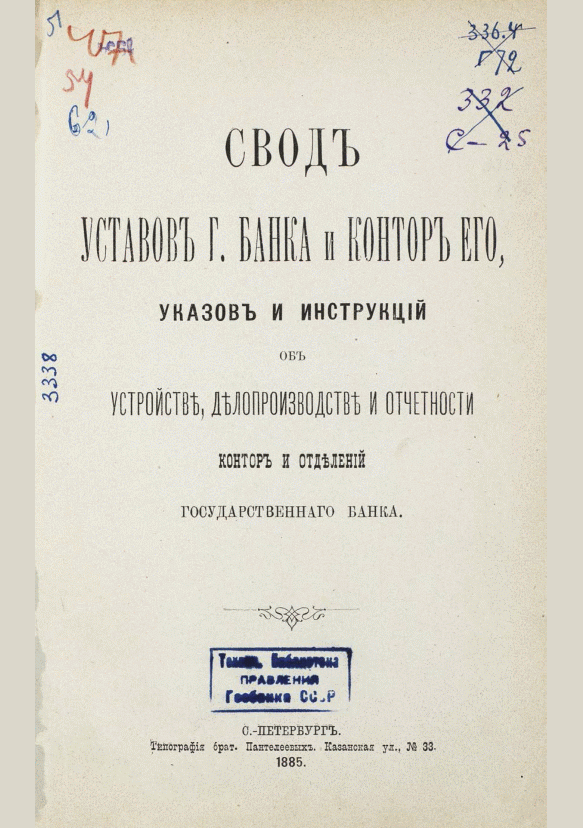 Свод уставов Государственного банка и контор его, указов и инструкций об устройстве, делопроизводстве и отчетности контор и отделений Государственного банка / Государственный банк. — Санкт-Петербург : Типография Министерства путей сообщения (А. Бенке), Фонтанка 99, 1885. — 364 с.. — . Напечатано по старой орфографии.