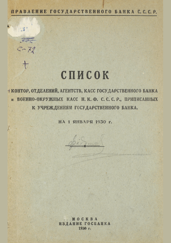 Список контор, отделений и агентств Государственного банка и Военно-Окружных касс НКФ СССР, приписанных к учреждениям Государственного банка / Государственный банк СССР. — Москва : Издание Госбанка, 1930. — 48 с.