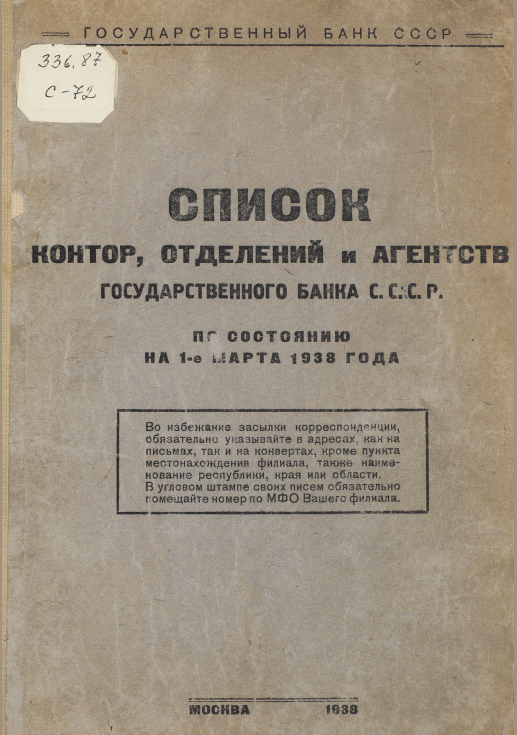 Список контор, отделений и агентств Государственного Банка СССР по состоянию на 1 марта 1938 года / Государственный банк СССР. — Москва : Издание Госбанка СССР, 1938. — 381 с.