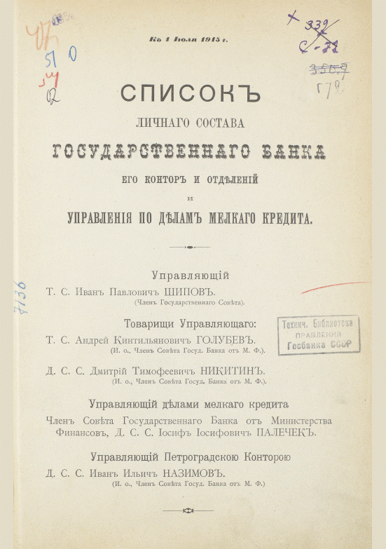 Список личного состава Государственного банка, его контор и отделений и управления по делам мелкого кредита к 1 июля 1915 г. / Государственный банк. — Петроград, 1915. — 714 с.. — . Напечатано по старой орфографии.