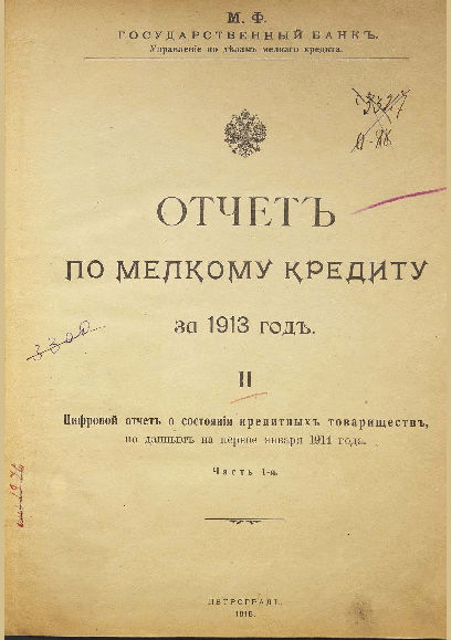 - 1. Отчет по мелкому кредиту за 1910 и 1911 годы с главнейшими данными за 1912 год / Государственный банк, Управление по делам мелкого кредита. — Петроград : Якорь, 1914. — 200, 107 с.