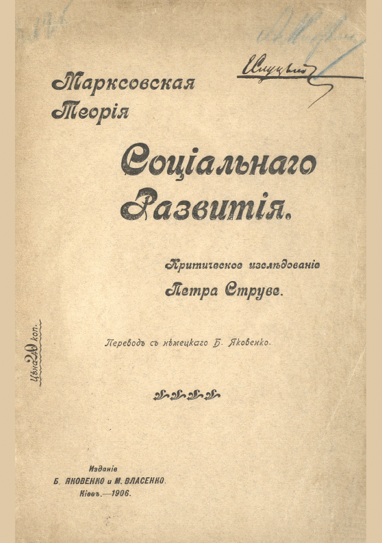 Струве, П. Марксовская теория социального развития : критическое исследование / П. Струве; перевод с немецкого Б. Яковенко. — Киев : Издание Б. Яковенко, М. Власенко, 1905. — 62 с.. — . Напечатано по старой орфографии.