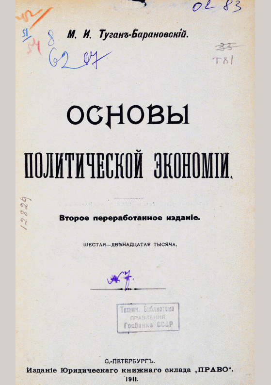 Туган-Барановский, М.И. Основы политической экономии / М. И. Туган-Барановский. — 2-е изд., перераб.. — Санкт-Петербург : Издание Юридического книжного склада "Право", 1911. — ХІ, 512 с.. — . Напечатано по старой орфографии. Алф. указ.: с. 511-512.