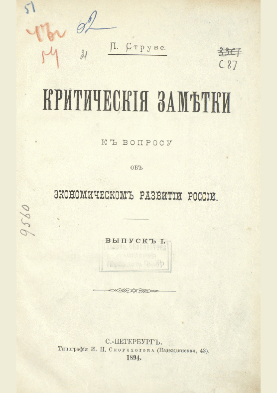 Струве, П.Б. Критические заметки к вопросу об экономическом развитии России. Вып. 1 / П. Б. Струве. — Прижизн. изд.. — Санкт-Петербург : Типография И.Н. Скороходова, 1894. — Х, 291 с.. — . Напечатано по старой орфографии.