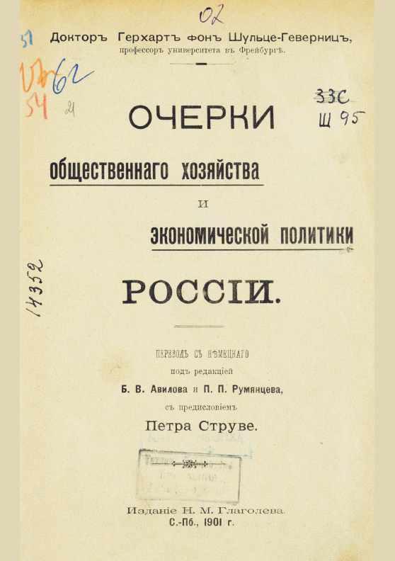 Шульце-Геверниц, Г. фон Очерки общественного хозяйства и экономической политики России / Г. фон Шульце-Геверниц; редакторы перевода с немецкого: Б. В. Авилов, П. П. Румянцев; автор предисловия П. Б. Струве. — Прижизн. изд.. — Санкт-Петербург : Издание Н.М. Глаголева, 1901. — XVI, 506 с.+ 1л. табл.. — . Напечатано по старой орфографииПеревод издания: Volkswirtschaftliche Studien aus Russland.