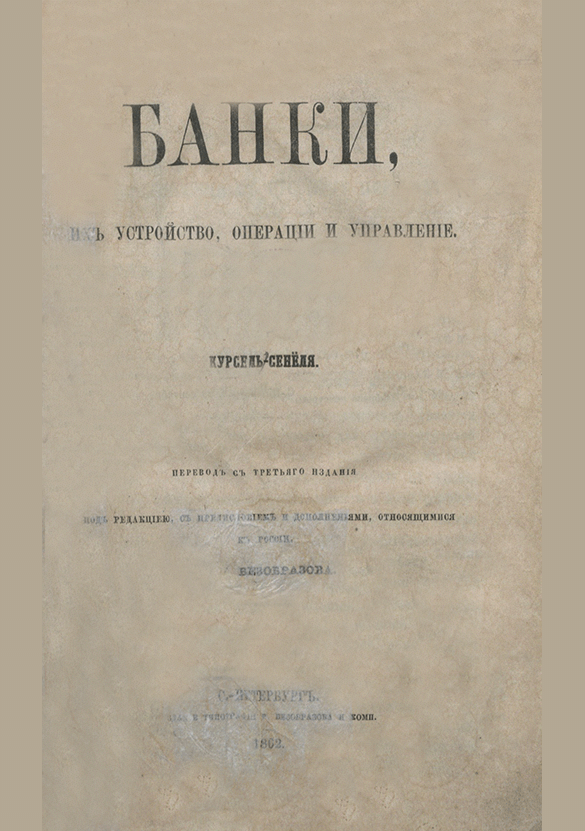 Курсель-Сенёль, Ж.Г. Банки, их устройство, операции и управление / Курсель-Сенёля; Ред. В.П. Безобразов. — Санкт-Петербург : Издание типографии В. Безобразова и Ко, 1862. — XXXVII, 721, VI с.. — . Напечатано по старой орфографии.