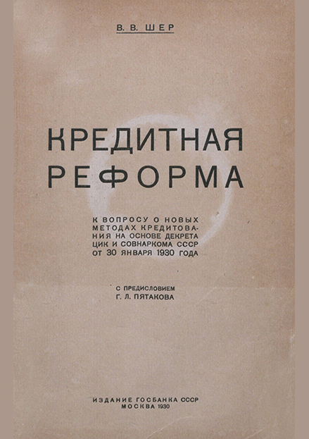 Шер, В.В. Кредитная реформа : К вопросу о новых методах кредитования на основе Декрета ЦИК и Совнаркома СССР от 30 января 1930 г. / В.В. Шер. — Москва : Издание Госбанка СССР, 1930. — 102 с.. — 0.50 р.