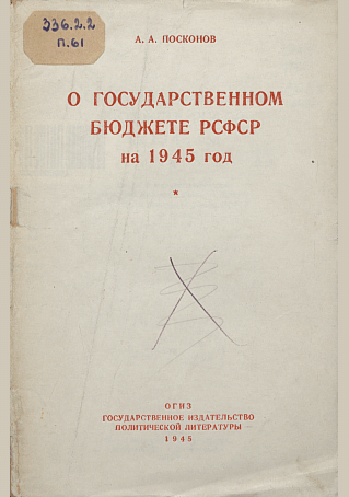 Посконов, А.А. О Государственном бюджете РСФСР на 1945 год : доклад и заключительное слово Народного Комиссара Финансов РСФСР на VI сессии Верховного Совета РСФСР 1-го созыва 5-8 июня 1945 г. / А. А. Посконов. — Москва : Госполитиздат, 1945. — 38 с.: портр.. — 0.40 р.
