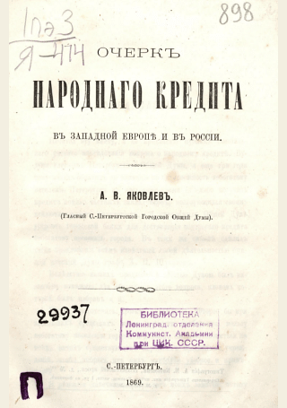 Яковлев, А.В. Очерк народного кредита в Западной Европе и в России / А. В. Яковлев. — Санкт-Петербург : Типография А.М. Котомина, 1869. — V, 326 с.. — . Напечатано по старой орфографии.