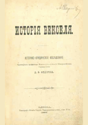 Федоров, А.Ф. История векселя : историко-юридическое исследование / А. Ф. Федоров. — Одесса : Типография Штаба Округа, 1895. — 107 с.. — . Напечатано по старой орфографии. — 5625.00 р.