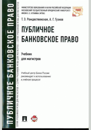 Рождественская, Т.Э. Публичное банковское право : учебник для магистров / Т. Э. Рождественская, А. Г. Гузнов; Московский государственный юридический университет им. О.Е. Кутафина. — Москва : Проспект, 2016. — 448 с.. — (Серия учебников МГЮА для магистров). — ISBN 978-5-392-21483-9 : 848.00 р.