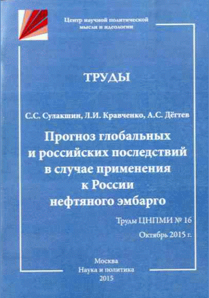 Сулакшин, С.С. Прогноз глобальных и российских последствий в случае применения к России нефтяного эмбарго / С. С. Сулакшин, Л. И. Кравченко, А. С. Дегтев. — Москва : Наука и политика, 2015. — 32 с.: ил.. — (Труды; № 16. Октябрь 2015 г.).