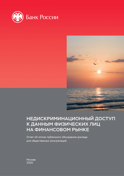 Недискриминационный доступ к данным физических лиц на финансовом рынке / Центральный банк Российской Федерации, Департамент стратегического развития финансового рынка. — Электрон. текстовые дан.. — Москва : Банк России, 2020. — 3 с.. — (Отчет об итогах публичного обсуждения доклада для общественных консультаций).