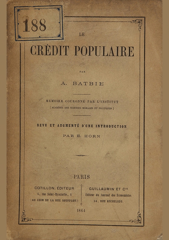 Batbie, A. Le credit populaire / A. Batbie. — Revu et augm. d'une introduc.. — Paris : Cotillon : Guillaumin et Cie, 1864. — 367 p.. — Append.: с. 345-362.