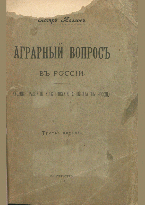 Маслов, П. Аграрный вопрос в России : условия развития крестьянского хозяйства в России / П. Маслов. — 3-е изд.. — Санкт-Петербург : Типография т-ва "Общественная Польза", 1906. — ХІІІ, 462 с.: табл.. — . Напечатано по старой орфографии. — (в пер.) : 60.00 р.