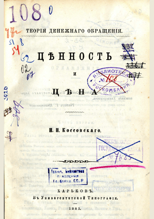 Коссовский, Н.Н. Ценность и цена / Н. Н. Коссовский. — Харьков : Университетская типография, 1883. — 266 с.. — 20.00 р.