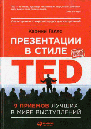 Галло, К. Презентации в стиле TED : 9 приемов лучших в мире выступлений : перевод с английского / К. Галло. — 2-е изд.. — Москва : Альпина Паблишер, 2016. — 253 с.: ил.. — Перевод издания: Talk like TED: the 9 public-speaking secrets of the world's top minds. — ISBN 978-5-9614-5596-0 : 669.00 р.
