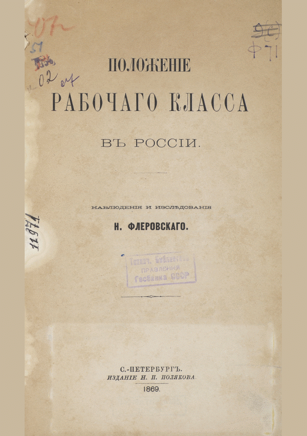 Флеровский, Н. Положение рабочего класса в России : наблюдения и исследования / Н. Флеровский. — Санкт-Петербург : Издание Н.П. Полякова, 1869. — VI, 494 с.: карты- 1. — . Напечатано по старой орфографии. — (в пер.) : 58.00 р.