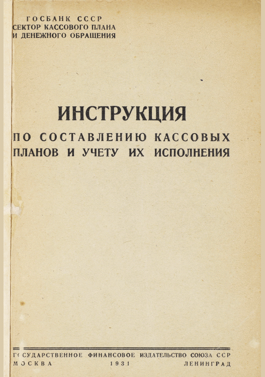 Инструкция по составлению кассовых планов и учету их исполнения / Государственный банк СССР, Сектор кассового плана и денежного обращения. — МоскваЛенинград : Госфиниздат СССР, 1931. — 32 с.. — 0.10 р.