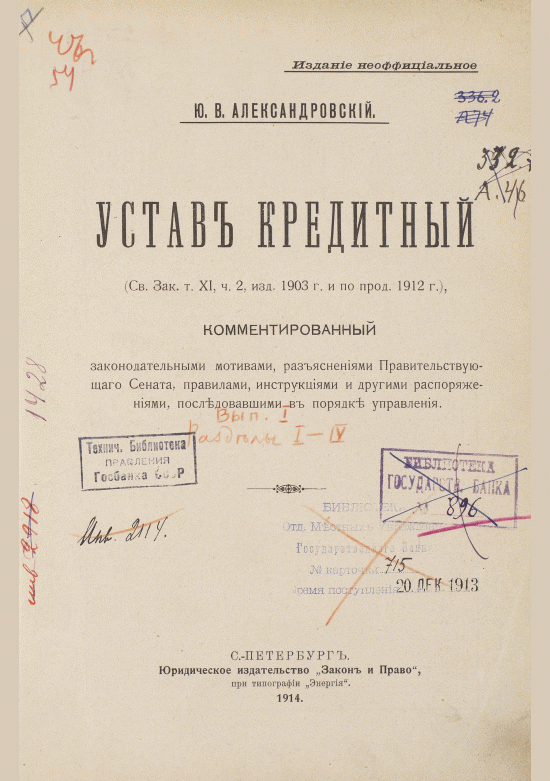 Александровский, Ю.В. Устав кредитный (Св. Зак. т. XI, ч. 2, изд. 1903 г. и по прод. 1912 г.). Вып. 1. Разделы I-IV : Комментированный законодат. мотивами, разъяснениями Правительствующего Сената, правилами, инструкциями и др. распоряжениями последовавшими в порядке управления / Ю. В. Александровский. — Неофиц. изд.. — Санкт-Петербург : Закон и Право, 1914. — 596 с.. — . Напечатано по старой орфографии. Содержание : Устав Государственной Комиссии Погашения Долгов (стр.31-177); О Государственных Долгах в особенности (стр.178-268); О Государственных Кредитных Билетах (стр.269-285); Устав Государственного Банка (стр.286-596). — (в пер.) : 40.00 р.