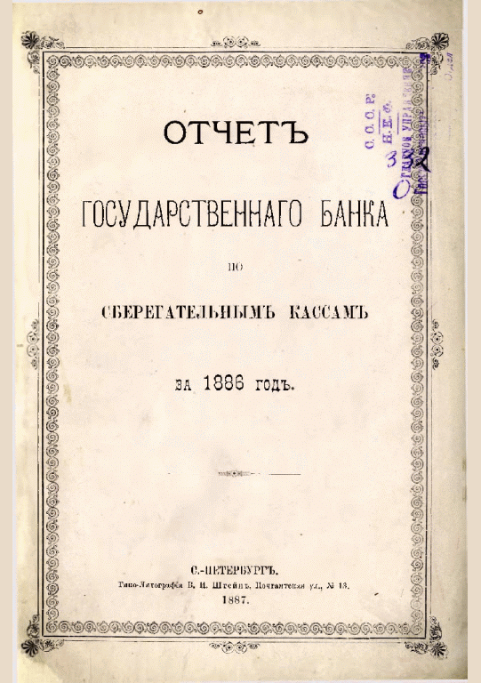 Отчет Государственного банка по сберегательным кассам за 1886 год / Государственный банк. — Санкт-Петербург : Типо-Литография В.И. Штейна, 1887. — 78 с.: табл. 12. — . Напечатано по старой орфографии.