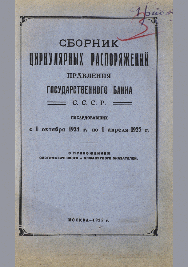 Сборник циркулярных распоряжений Правления Государственного банка СССР, последовавших с 1 октября 1924 г. по 1 апреля 1925 г. : с приложением систематического и алфавитного указателей / Государственный банк СССР. Правление. — Москва, 1925. — XXXVII, 253 с.