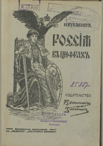 Рубакин, Н.А. Россия в цифрах: Страна. Народ. Сословия. Классы : опыт статистической характеристики сословно-классового состава населения русского государства: (на основании официальных и научных исследований) / Н. А. Рубакин. — Санкт-Петербург : Издательство "Вестника Знания" (В.В. Битнера), 1912. — 228 с.. — . Напечатано по старой орфографии.