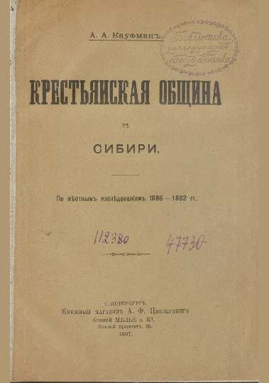 Кауфман, А.А. Крестьянская община в Сибири : по местным исследованиям 1886-1892 гг. / А. А. Кауфман. — Прижизн. изд.. — Санкт-Петербург : Книжный магазин А.Ф. Цинзерлинга, бывший Мелье и К°, 1897. — 304 с.. — . Напечатано по старой орфографии.