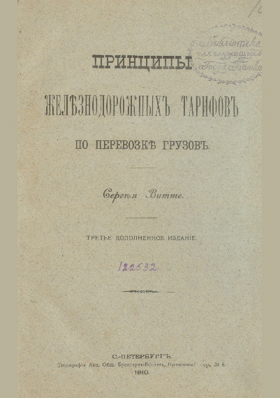 Витте, С.Ю. Принципы железнодорожных тарифов по перевозке грузов / С. Ю. Витте. — 3-е изд., доп., прижизн. изд.. — Санкт-Петербург : Типография акционерного общества Брокгауз-Ефрон, 1910. — V, 296 с.: ил., табл.. — . Напечатано по старой орфографии. Содержание : Лекция гр. С. Ю. Витте, читанная 7 апреля 1910 г. в актовом зале Института инженеров путей сообщения.