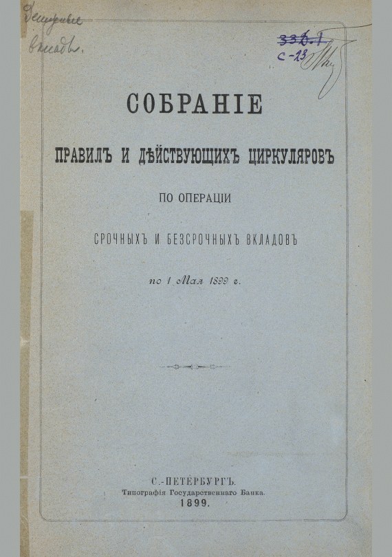 Собрание правил и действующих циркуляров по операции срочных и бессрочных вкладов по 1 мая 1899 г. / Государственный банк. — Санкт-Петербург : Типография Государственного Банка, 1899. — 26, 9, 9 [=44] с.. — . Напечатано по старой орфографии.
