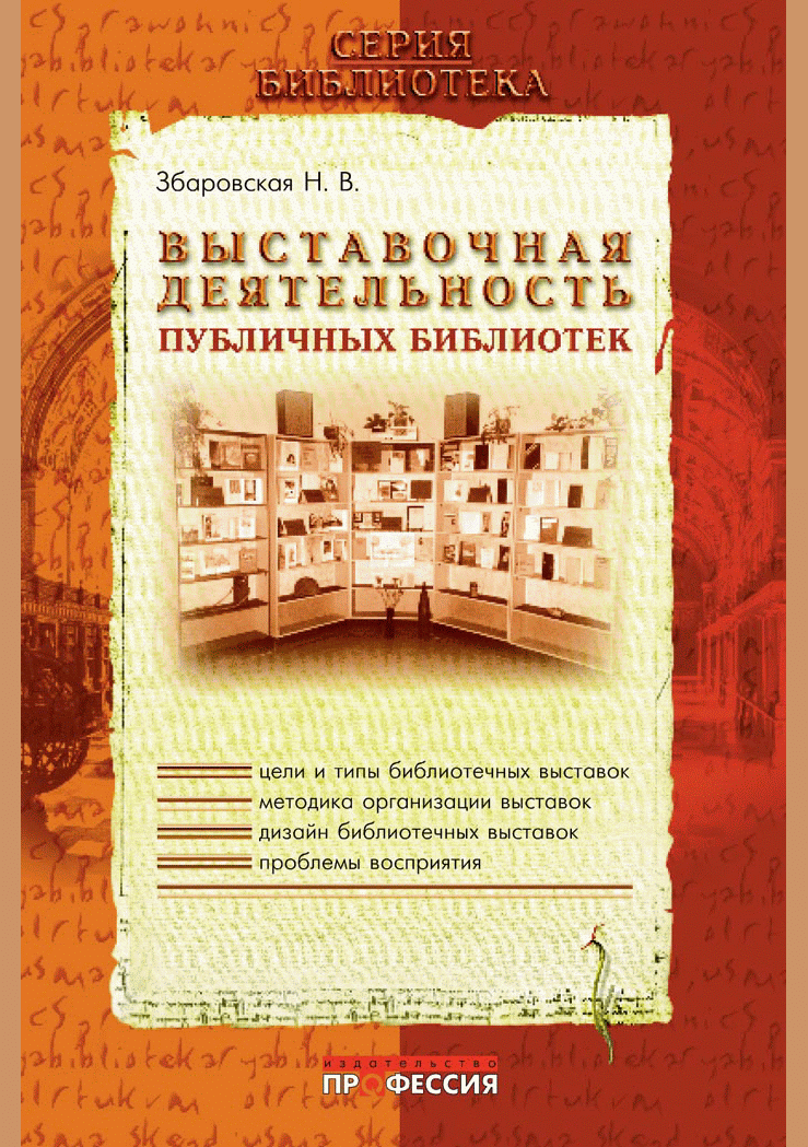 Збаровская, Н.В. Выставочная деятельность публичных библиотек : практическое пособие / Н.В. Збаровская. — Санкт-Петербург : Профессия, 2004. — 224 с.. — (Библиотека). — 142.20 р.