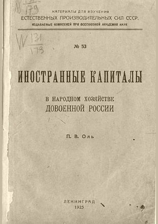 Оль, П.В. Иностранные капиталы в народном хозяйстве довоенной России / П. В. Оль. — Электрон. текстовые дан.. — Ленинград, 1925. — 35 с.. — (Материалы для изучения естественных производительных сил СССР, издаваемые комиссией при Всесоюзной Академии наук; № 53).