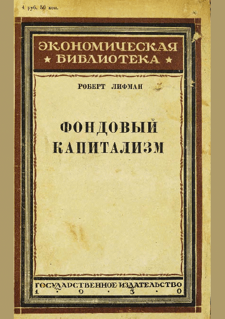 Лифман, Р. Фондовый капитализм : общества для участия и финансирования / Р. Лифман; перевод с немецкого Л. И. Кунин; редактор, автор предисловия А. Б. Штерн. — МоскваЛенинград : Государственное издательство, 1930. — LX, 424 с.: табл.- 1. — (Экономическая библиотека). — . Есть издание на нем. яз., 1913 г. - 336М2 L69. Библиогр.: с. LIX-LX.- Алф.-Предм. указ.: с. 404-412Перевод издания: Beteiligungs- und Finanzierungsgesellschaften: Eine Studie über den modernen Effektenkapitalismus in Deutschland, den Vereinigten Staaten, der Schweiz, England, Frankreich und Belgien. — 3000.