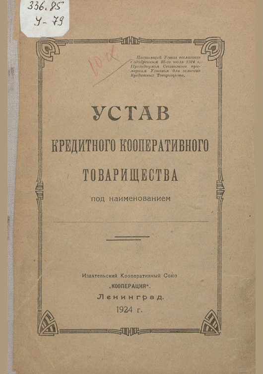 Устав Кредитного кооперативного товарищества : одобрен 25 июля 1924 года Президиумом Севзапэкосо примерным Уставом для сельских Кредитных товариществ. — Ленинград : Кооперация, 1924. — 36 с.