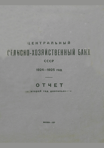Центральный Сельско-Хозяйственный банк СССР. 1924-1925 год. Второй год деятельности. — Москва : Центральный Сельско-Хозяйственного банк СССР, 1926. — 96, 32, [44] с.: граф., карты, табл.