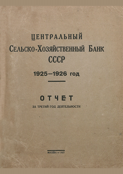 Центральный Сельско-Хозяйственный банк СССР. 1925-1926 год. Отчет за третий год деятельности. — Москва : Центральный Сельско-Хозяйственный банк СССР, 1927. — 63 с.: табл.. — 0.60 р.