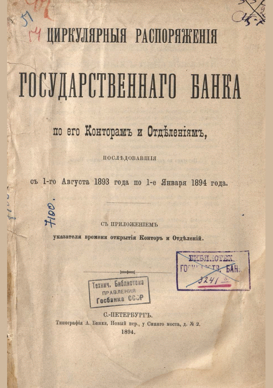 Циркулярные распоряжения Государственного банка по его конторам и отделениям, последовавшие с 1 августа 1893 года по 1 января 1894 года : с прил. указателя времени открытия контор и отделений / Государственный банк. — Санкт-Петербург, 1894. — 75 с.. — . Напечатано по старой орфографии.