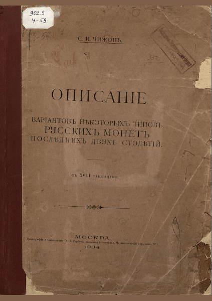Чижов, С.И. Описание вариантов некоторых типов русских монет последних двух столетий / С. И. Чижов. — Москва : Типография и Словолитня О.О. Гербека, 1904. — 75 с.+ XVIIIтабл. [с изобр. монет]. — . Напечатано по старой орфографии.