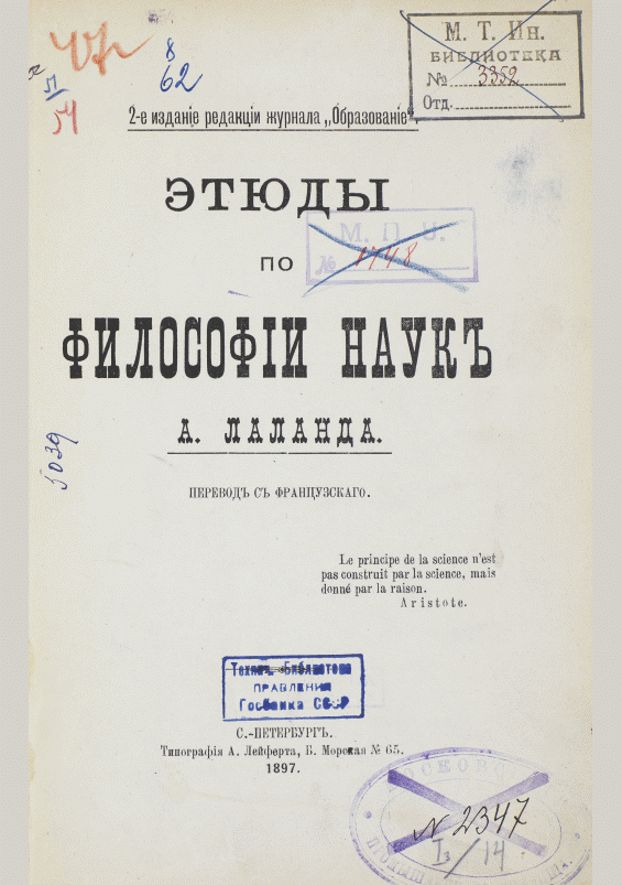 Лаланд, А. Этюды по философии наук : перевод с французского / А. Лаланд. — 2-е изд. редакции журнала "Образование". — Санкт-Петербург, 1897. — 188 с.. — . Напечатано по старой орфографииПеревод издания: Lectures sur la Philosophie des sciences. — 5.00 р.