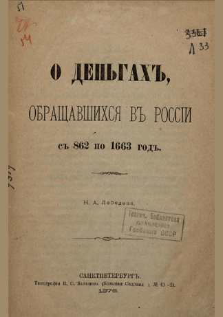 Лебедев, Н.А. О деньгах, обращавшихся в России с 862 по 1663 год / Н. А. Лебедев. — Санкт-Петербург : Типография В.С. Балашева, 1876. — 10 с.. — . Напечатано по старой орфографии.. — 0.40 р.