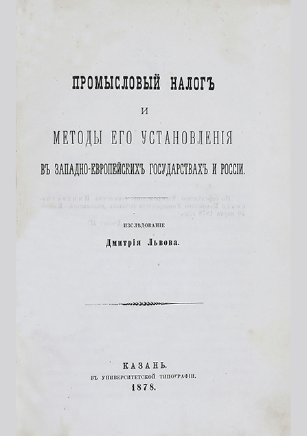 Львов, Д. Промысловый налог и методы его установления в западно-европейских государствах и России / Дм. Львов. — Казань : Типография Императорского казанского университета, 1878. — 224 с.. — 3.00 р.