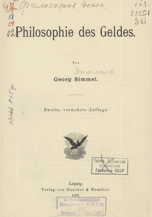 Simmel, G. Philosophie des Geldes / G. Simmel. — Zweite, vermehrte Auflage. — Leipzig : Verlag von Duncker & Humblot, 1907. — XIV, 585 S.. — (в пер.) : 7.50 р.