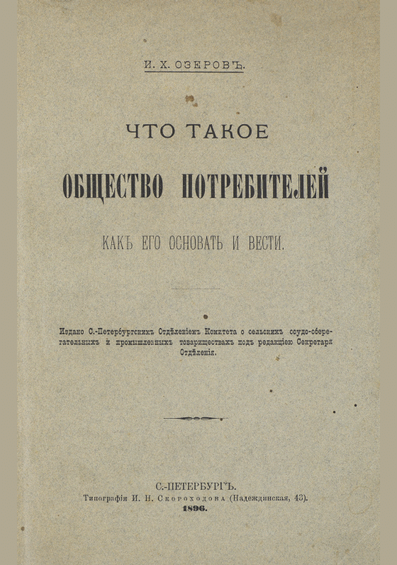 Озеров, И.Х. Что такое общество потребителей: Как его основать и вести / И. Х. Озеров. — Санкт-Петербург : Санкт-Петербург Отделение Комитета о сельских ссудо-сберегательных и промышленных товариществах, 1896. — 71 с.. — . Напечатано по старой орфографии. — 224.00 р.