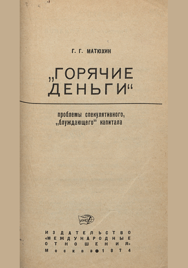 Матюхин, Г.Г. "Горячие деньги": проблемы спекулятивного, "блуждающего" капитала / Г. Г. Матюхин. — Москва : Международные отношения, 1974. — 176 с.: ил.. — 0.58 р.
